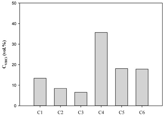 Using the calibration curve, the individual volume of Cn HC (VCn-HC) in the injected gas products can be obtained. Notice that HCs with a Cn value higher than seven are trace components and are thus assumed to be negligible. The volume percentage of each hydrocarbon of C1–C6 in gaseous HCs with a sum of 100% is shown in Figure 5. The C4 HC expressed, equivalent to butane, is the major compound of the gaseous hydrocarbons. Hydrocarbons other than C4 HC are also obviously present.