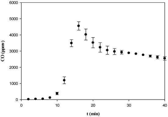 By using a gas detector, CO, NOx, and SO2 from the gas products are continually detected per minute from the 40 min torrefaction process. The diagrams which illustrate the relationship between the concentration of emissions and the residence time of torrefaction are established. Taking an example in Figure 6 for the CO emission from the torrefaction of WBCT, average gas concentrations with the error bars standing for the standard deviation from repetitive analyses are shown.