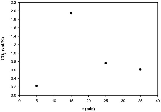 By sampling gas products every 10 min with a gas bag, the trend of CO2 emission through torrefaction could be constructed. The concentrations of CO2 in the gas bags represent the instant concentrations of 5, 15, 25, and 35 min through the 40 min torrefaction process. In Figure 9, the maximum value appears at around 15 min with a CO2 measurement of 1.94 vol %.