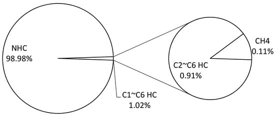 According to the gas analyses of Table 4, the volume fractions of the component gases can be presented, as in Figure 10. The results indicate that non-hydrocarbons (NHC) are the main compounds in the gas products, excluding the carrier nitrogen. CH4 (C1 HC) and other HCs of C2–C6 HCs only occupy 0.11 vol % and 0.91 vol %, respectively, of the total emissions, excluding the carrier nitrogen. The essential HCs contain C1–C6 HCs.