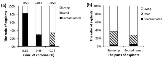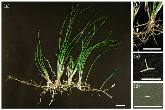 For the practical, aseptic primary culture of E. acicularis, we examined three concentrations of NaClO for the sterilization of explants and the parts used for explants (Figure 1c,d). Young ramets developing near the stolon tips were excised (Figure 1c), sterilized in NaClO (0.15%, 0.45%, or 0.75% of available chlorine), and cultured on solid medium. Figure 2a shows the result of one-week culturing. For a chlorine concentration of 0.75%, we observed a high rate of aseptic and living explants and a low rate of explants contaminated with microbes. Thus, a chlorine concentration of 0.75% was adopted for subsequent experiments. To verify the suitable parts for explants, we used stolon tips (Figure 1d) in addition to young ramets (Figure 1c). Figure 2b shows that both stolon tips and young ramets are suitable for primary culture. Figure 2c,d show the explants cultured for 31 days on solid medium. Both stolon tips and young ramets grew developed ramets with many terrestrial stems and roots. Therefore, both stolon tips and young ramets are suitable for primary culture.