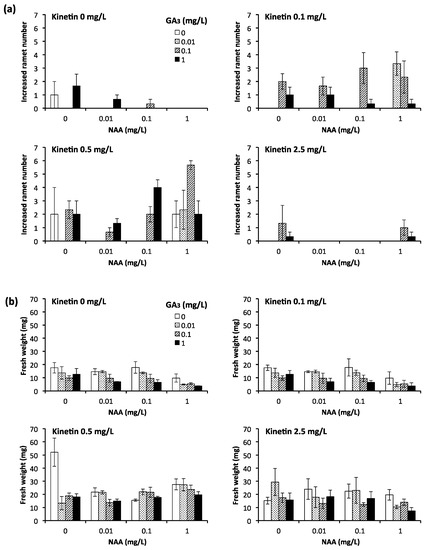 The number of newly formed ramets from a young isolated ramet (a) and the fresh weight of newly formed communities from a young isolated ramet (b) in 4 weeks at various concentrations of kinetin (0, 0.1, 0.5, 2.5 mg/L), gibberellic acid-3 (GA3) (0, 0.01, 0.1, 1 mg/L), and 1-naphthaleneacetic acid (NAA) (0, 0.01, 0.1, 1 mg/L) (n = 3, Bar: standard error (SE)). These results were representatives of three experiments.