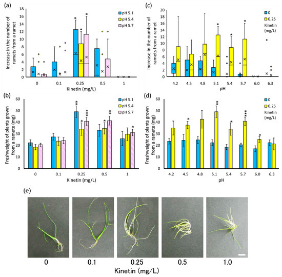 Effects of various concentrations of kinetin and various pH ranges on the growth of ramets (a,b,c,d). The number of newly formed ramets from a young isolated ramet (box plot, X indicates average, n = 12) (a,c) and the weight of newly formed plants from a young isolated ramet (bar graph, n = 12, Bar: SE) (b,d) in 4 weeks at various concentrations of kinetin (0, 0.1, 0.25, 0.5, 1 mg/L) and three pH values (5.1, 5.4, 5.7) (a,b) or in the absence or presence of kinetin (0.25 mg/L) and various pH values (4.2 to 6.3) (c,d). Asterisks indicate significant differences from the value of 0 mg/L kinetin under the same pH (two-sided Wilcoxon rank sum test; (a,c) two-sided Welch t-test; (b,d) * p < 0.05; ** p < 0.01; *** p < 0.001). (e) Plants grown from a young, isolated ramet cultured for 4 weeks in various concentrations of kinetin at pH 5.7. These results were representatives of two experiments.
