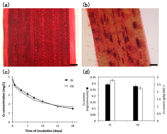 Staining of phytoliths in E. acicularis without (a) or with (b) 0.1 mM Si during subculture. Bar = 50 µm; (c) The decrease in Cs concentration in the solution containing plants subcultured without or with 0.1 mM Si (n = 3, Bar, SE). This result is representative of two similar experiments. (d) Accumulation of Cs in plant communities after 4 weeks of incubation of (c) (n = 3, Bar, SE). The results of (c,d) were measured by inductively coupled plasma-mass spectrometry (ICP-MS).
