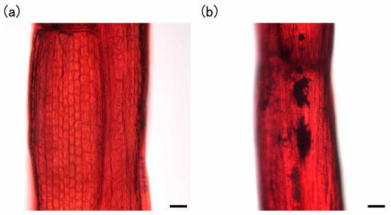 The aseptically cultured E. acicularis plants were exposed to heavy metals to evaluate their accumulation potential. Monocotyledons such as Poaceae and Cyperaceae frequently accumulate silicon as “plant opals”, also known as phytoliths. We also examined whether silicon addition during subculture is effective for heavy metal accumulation. We used two types of plants subcultured either in the absence or in the presence of 0.1 mM Na2SiO3. The plants supplied with Si showed phytoliths under a light microscope (Figure 5a,b). These plants were further exposed to approximately 4.8 mg/L Cs, and the concentration of Cs in the solution decreased steadily (Figure 5c). The decreased Cs was effectively accumulated for 28 days by both plants subcultured with or without of 0.1 mM of Si (Figure 5d). Cs accumulations were 2782 ± 48 and 2248 ± 99 mg/kg DW in −Si and +Si E. acicularis, respectively.