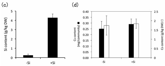 Furthermore, we added 1 mM of Si during subculture to confirm the effect of higher concentrations of Si. The plants subcultured in the presence of 1 mM Na2SiO3 showed the presence of phytoliths (Figure 6a,b) and the accumulation of Si (Figure 6c). Moreover, Cs was accumulated in plants regardless of the presence or absence of Si (Figure 6d).