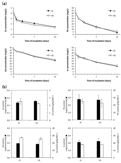 Using the plants subcultured with or without of 1 mM Si, we investigated the accumulation of heavy metals from the solution with approximate concentrations of 4 mg/L Zn, 41 mg/L Pb, 47 mg/L Cd, or 38 mg/L In for 14 days (Figure 7). The concentrations of these heavy metals were selected according to the previous reports using E. acicularis [6] and our other experiments to estimate the ability of heavy metal accumulation. In addition, the duration of 2 weeks to expose plants to these heavy metals was selected to estimate minimum capacity of heavy metal accumulation based on the result of Cs removal from the basal solution (Figure 5) that changes in the Cs concentration were prominent in first 2 weeks. Zn, Pb, Cd, and In were continuously removed from the solutions for two weeks (Figure 7a) and effectively accumulated in plants both in the presence and absence of Si (Figure 7b).