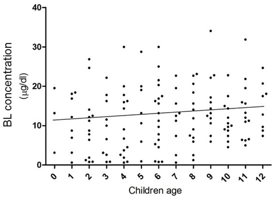 GM and BL ranges were higher in communities A and B closer to the mining waste sites (p > 0.05): GM and range values for community A were 13.6 μg/dL (2.0 to 26.3 BLL range), Community B contained 15.9 μg/dL of lead in blood (9.0 to 33.0), and community C resulted with 5.5 μg/dL (0.7 to 28). In similarity to community C, the furthest from the mining waste, community D had 5.5 μg/dL ranging from 0.7 to 15.4 GM and BLL values, respectively. Thus, by a linear regression model comparing distance from the communities to the mining waste site, the communities localized near to the mining tailings had greater BL values in comparison with far communities.