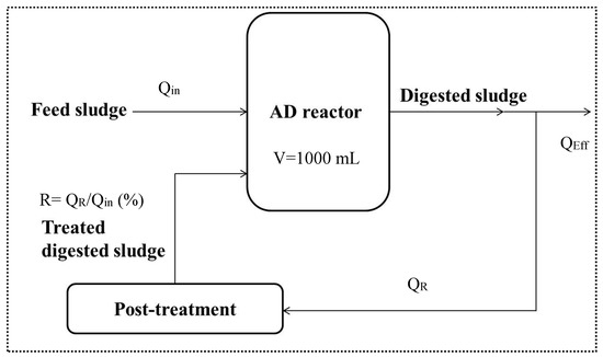 Schematic diagram of the anaerobic digestion process incorporating a post-treatment. Qin = influent flowrate (mL/day), Qeff = effluent flowrate (mL/day), QR = recycled flowrate (mL/day), and V = working volume (mL).