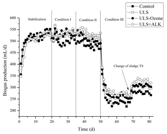 The tested post-treatments showed the highest VS removals in Condition III. This was because longer residence time was given for the hydrolysis of feed and post-treated sludge. Battimelli et al. [14] showed that the COD and solids removal rates started to decrease when the recycle ratio (R) between recycled sludge (treated with 0.16 g O3/g TS) to feed sludge exceeded 25% due to the reduction of SRT. This reduction is caused by cell lysis in the recycle line due to the post-treatment. These results confirm the importance of an appropriate recycle ratio and sufficient residence time of the anaerobic reactor with the post-treatment incorporated.