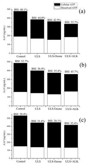 The BSI, the ratio between the dissolved and total ATP concentrations, was used to quantify the stress of microbial communities in the anaerobic reactor. Surprisingly, the BSI in the ULS-Ozone reactor was slightly lower than in the ULS reactor. This meant that the use of ozone in the post-treatment did not impose further stress on the anaerobic reactor compared to ULS alone.