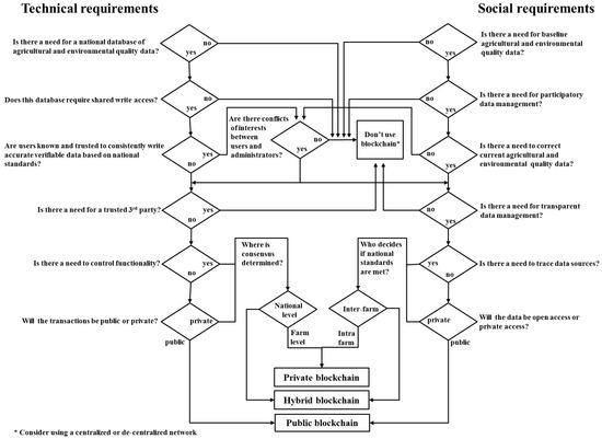 Re-contextualized and adapted from Suichies’ [60] visual summation of Greenspan’s [61] cautionary article for businesses considering embarking on an infrastructure transformation, Figure 3 is a proposed tool that can be used by experts to determine if there is a need for blockchain technology in spite of its limitations and with respect to agricultural environmental data management. Experts can quickly make a dual assessment such that if a need for a bridging mechanism of potential gaps in IT infrastructure exist, blockchain technology is recommended as an enabling environment for ICT in agriculture. Namely, to determine if centralized databases are sufficient for their technical requirements. Similarly, if gaps in knowledge flows among cross-sectoral stakeholders exist and potential systemic-wide bias and/or opaqueness in national processes and agricultural environmental data management persist, blockchain technology is recommended. Figure 3 then also assists experts to decide if trust in a centralized system is suitable for their social requirements in the context of agricultural environmental data management. Based on the flowchart outcomes, blockchain-based approaches may hold potential for enhancing agricultural environmental monitoring and data management, and achieving sustainable agricultural development with ICT.