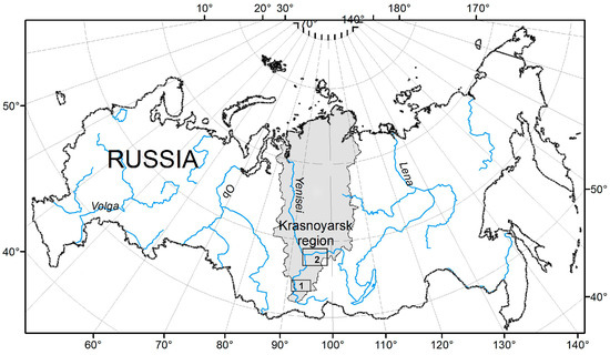 Study areas. 1—West Sayan area; 2—Northern Angara region.
