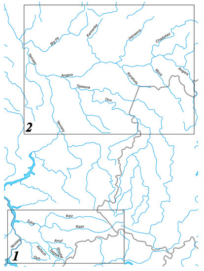 We studied forest ecosystems and river catchments found in the West Sayan and Northern Angara landscape areas (Figure 1), located in Central Siberia. These two regions differ in orography, in climate, soil, and vegetation.