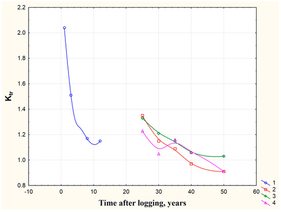 Runoff dynamics for experimental clear cuts and post-cutting stands vs. runoff for untouched dark-needled forest of mountain taiga AVB, West Sayan. (1) a clear cut (grass-small shrub community); (2) fir stand; (3) birch stand; and (4) aspen stand. Ktr is runoff transformation coefficient (see Table 3).