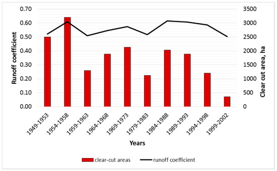 Of all economical activities practiced in river basins, forest clearcutting and post-cutting regeneration have the greatest influence on water balance and runoff [17,18,19,20,21,22]. Hydrological regime studies that covered 100 paired river basins [19] showed that clearcutting increased water yield considerably. Maximum water yield increase, from 110 to 825 mm, resulted from clear cuts of tropical rainforests [23].