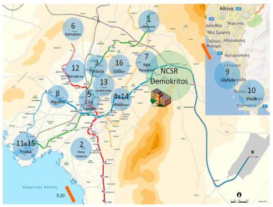 Map of Athens city and suburbs. Participants’ code (1–16) and the areas of each residence are marked with a blue circle. Metro and train routes are marked with red, blue, and green lines. Bus route to/from NCSR Demokritos (green circle) is marked with a black dashed line.