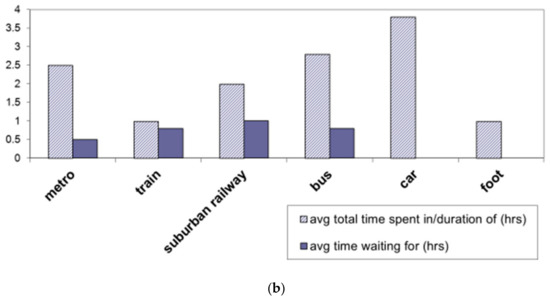 The information gathered from the participants’ activity logbooks revealed that metro and bus were the most frequently used means of commuting, while the majority of the participants used two different ways to commute (Figure 2a,b).