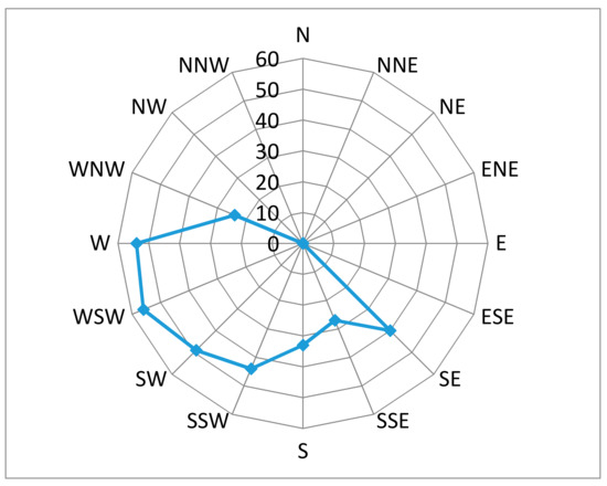 Personal, indoor, and outdoor sample analysis results did not indicate any limit exceedance (Directive 2008/50/EC: 120 µg/m3, WHO Air Quality Guidelines 2005: 100 µg/m3, for ambient air). Table 2 presents the statistics for personal, indoor, and outdoor ozone levels. The measured outdoor values (in NCSR Demokritos and residences’ areas) were well correlated to the five-day averaged value provided by the National Air Quality Monitoring network (r = 0.74, p < 0.05), while being comparable to those reported by Grivas et al. [23] for the city of Athens. The highest “house-outdoor” concentration was noticed for participants living mainly in the north suburbs of Athens (Figure 1: participants # 1, 7, 10, 16) while the lowest were noticed for participants living downtown (Figure 1: participants # 3, 5, 13). According to WHO (WHO air quality guidelines—global update 2005), ozone concentrations within the city itself are often lower than those in the surrounding countryside, as fresh nitric oxide emissions from traffic suppress high concentrations of ozone entering in air from the surrounding countryside. This was also depicted by the wind direction versus ozone concentration rose diagram presented in Figure 3 (data provided by the National Air Quality Monitoring and Hellenic National Meteorological service networks). As it seems, the prevailing wind had a southwestern origin (i.e. from the center of the city) and favored the photochemical ozone formation at the northern parts of the basin which comprises a frequent pattern for Attiki basin, especially during the warm season [37,40].
