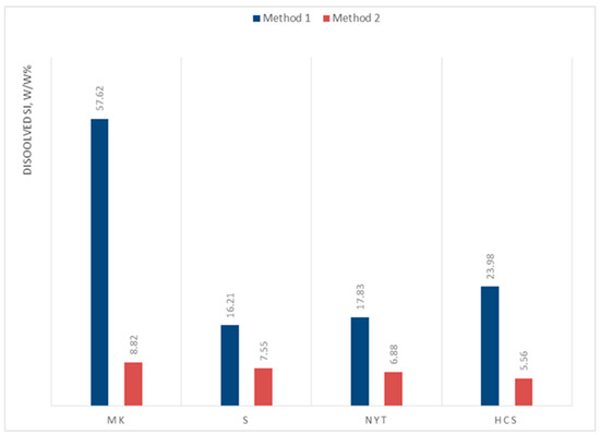 Figure 2. Dissolved Si after leaching for 72 h in 7 M NaOH (% w/w).