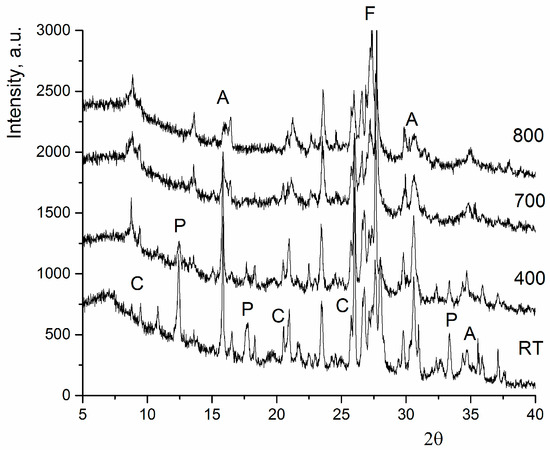 Figure 4. Phase evolution of the Neapolitan Yellow Tuff (NYT) sample treated up to 800 °C.