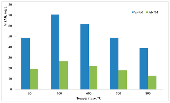 Figure 5 reported the Si (Al) released in the NYT sample after different heat-treatment at 72 h and 7 M alkaline solution in the dynamic test. The change in crystalline phases directly affects the leaching performance of the tuff, as reported in Figure 5. In fact, the heat treatment enhanced the reactivity of tuff up to 400 °C, due to the collapse of the crystalline zeolitic phases and the increase in the amorphous phases.