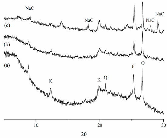 Figure 7. XRD spectra of (a) metakaolin, (b) metakaolin after 5 h of contact with NaOH 7 M solution and (c) metakaolin after 72 h of contact with NaOH 7 M solution (K = kaolinite, Q = quartz, F = feldspar, NaC = sodium carbonate).