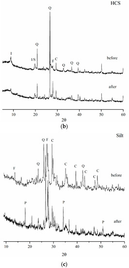 This can be explained by the fact that silt has the highest percentage of CaO (17.53% w/w) compared to other materials and, as the aluminosilicate network of the material starts decomposing under the attack of the highly alkaline solution, Ca2+ moves in the solution and precipitates as Ca(OH)2 [28]. The tuff after reactivity test showed the same crystalline phases of the starting material (Figure 8).