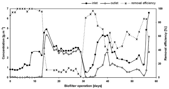 Nutrient supplementation was carried out twice during the operation of the BTF to maintain performance, at days 27 and 40. The additional nutrients tended to correlate with the removal efficiency, as can be observed in Figure 2. At day 27, the nutrient solution was supplied at a constant flow rate of 0.277 m3 h−1. The BTF attained a high removal efficiency of 86 to 93% between days 30 and 35, compared with efficiencies between 7 and 13% for the prior 15 days. After a while, the nutrient solution was consumed and removal efficiency decreased.