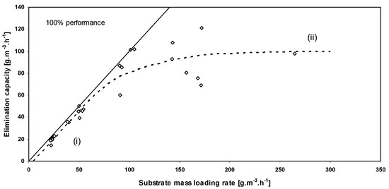 The elimination capacity is plotted as a function of the mass loading rate in Figure 3. Similar to most biological reactor operations, the relationship is linear (i) up to a critical substrate mass loading rate (between 80 and 100 g m−3 h−1), after which elimination capacity approaches a maximum value of 100 g m−3 h−1 asymptotically (ii), where it remains nearly constant and independent of the mass loading rate.