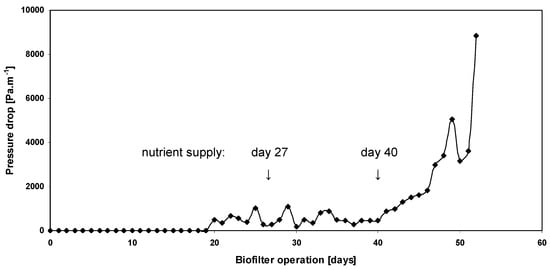 Visually, excessive accumulation of biomass on the perlite was observed as well as an increasing pressure drop after each application of nutrients (Figure 4), with the result being a partial clogging of the filter bed. If nutrient supply and concentration will, to some extent, improve the elimination capacity of a biological reactor, it will nevertheless also enhance microbial growth and initiate a pressure drop increase, as observed in the experiment. A reasonable pressure drop is crucial for optimal performance of the biotrickling filter because it directly impacts the energy required to drive air through the bioreactor, which is a substantial part of the operating costs. A long-term pressure drop under the recommended value of 700 Pa m−1 packing material is suggested [6], but in Figure 5 it can be seen that the pressure drop exceeded 8000 Pa m−1, at which point the experiment had to be discontinued. Potential methods, such as backwashing, for removing excess biomass in biotrickling filters have been identified and discussed [8] but could not be implemented with the available equipment in this work.