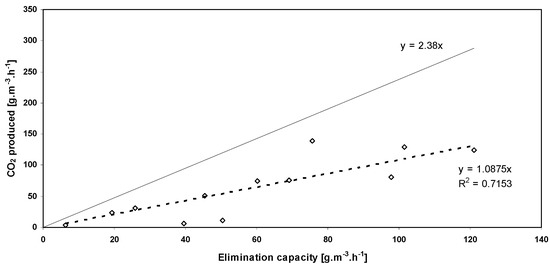 In a biological air treatment process most VOCs are aerobically degraded to water, carbon dioxide, and biomass with an approximate formula of C5H7NO2 [27]. Hence, another method employed for monitoring biotrickling filter performance and acquiring information on the extent of mineralization is based on the measurement of CO2 concentrations in the inlet and outlet air streams. For this purpose, the CO2 production rate was calculated and the results are shown in Figure 5 illustrating a linear relationship between CO2 production rate and elimination capacity, confirming previous observations [28]. If all carbon coming from butanol degradation was mineralized to CO2, the slope observed on such a plot should be approximately 2.38 since for every mole of butanol degraded (74 g), 4 moles (176 g) of CO2 would be produced, according to stoichiometry.