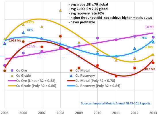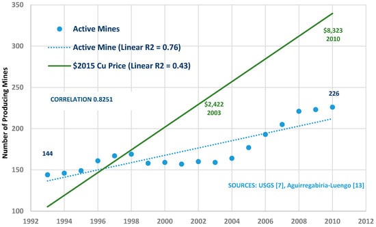 A recent study of actual annual mine records of 330 mines comprising 85% of world copper production sheds some light on the economics that may apply for all metals, and may hold keys to a deeper understanding of the relevant economic red flags of possibly incubating failure conditions []. The study reports that on average only 52% of mines were active at any time in their study period, 1993–2010 (173/330) and that 32% produced no mined output at all during the supercycle (maximum active was 226). This suggests the possibility that from 30% to 52% of all “still open” copper mines globally may not be economically feasible and cannot be expected to generate revenue sufficient to cover production costs. In many instances, perhaps mines should never have been developed in the first place. Certainly, no one would dispute there are many mines which have never been profitable, and have frequently been in and out of production due to price sensitivity.