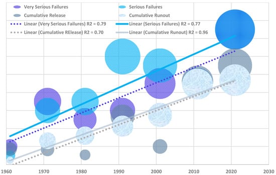 Estimating major failures by proven actuarial methods [] and projecting cumulative runout and release by trend line, the overall severity profile for the coming decade, 2016–2025 (Table 1), will be 67% higher for both major failure categories and severity will reach all-time highs with more modest projected increases of 5% and 8% respectively.