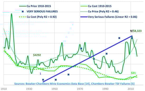 It is customarily assumed that as prices rise, profits and performance also rise with a concurrent effect of fewer high public severity failures. This paper challenges that notion through the authoritative findings of top mine analysts who found that performance during the supercycle was actually very lax as compared to the tight control in leaner times resulting in an unprecedented level of investor losses and write offs as prices across all commodities pushed steadily upward to post-1916 highs in 2011. Copper, the bellwether for base metals, reached a post-1916 high of $9411 ($2015) as compared to the prior 50-year average price of $5133 ($2015) []. Looking at failures, the incidence of highest severity TSF failures also reached a post-1916 high of 1.0 high-severity failures per year, as compared to the previous 50 mostly lean years of 0.56 high-severity failures per year.