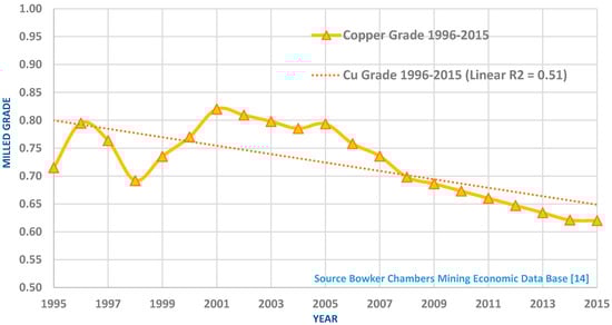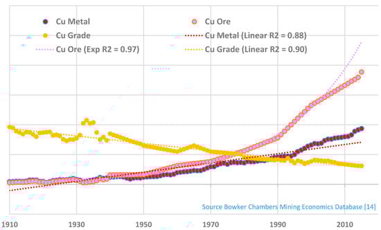 For this work, further exploring economics as a root cause of failure, the original mining economics database-by-decade was expanded to a publicly available annualized global database of the main economic descriptors; grade, copper production, price, ore production, and ore productions costs. The database [] includes complete technical documentation on sources and compilation methods, as well as tabs with raw data for all charts and tables in this paper, which were produced from that database.