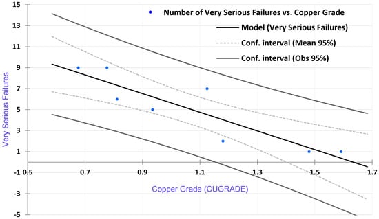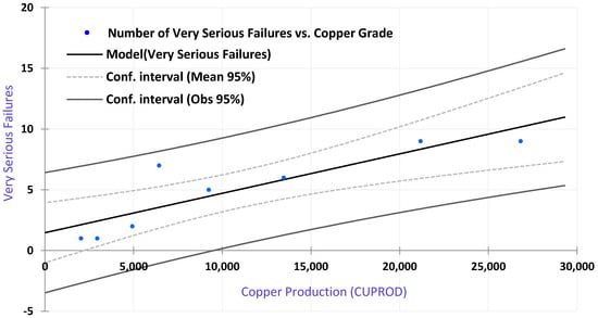 The regression of Very Serious Failures by ore production volume (copper production—CUPROD), essentially tailings waste volume, explained 76% of total variance as shown in Figure 8.