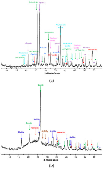 Two fly ashes of different mineralogy have been considered for this study, namely fly ash B (FAB) and fly ash R (FAR). The X-ray diffraction patterns of two fly ashes are reported in Figure 1. FAB is a fluidal bed combustion fly ash supplied by a power plant located in Italy. The raw material (Figure 1a) is composed by vitreous and crystalline phases which include calcium-containing minerals: anhydrite, calcite and other minerals: quartz and hematite. The chemical composition of the FAB is given in Table 1. FAR is a fly ash produced by a German thermoelectric power plant at higher combustion temperature. It is mainly composed (Figure 1b) of alumino-silicate glasses with varying amounts of crystalline phases such as quartz, mullite and hematite. The halo between 17° and 30° clearly identify the vitreous phases of the ash. The chemical composition of the FAR is given in Table 2. Both fly ashes are characterized by low free calcium content.