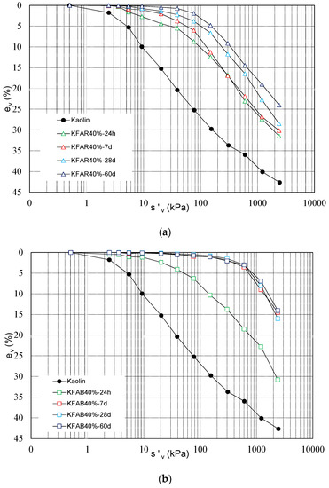 1D compressibility curves of not treated and alkali activated binder treated kaolin (KFAR40% and KFAB40%) at increasing curing times, namely 24 h, 7, 28 and 60 days are reported in Figure 3a,b. Addition of alkali activated binders induces an overall reduction of compressibility of the treated samples, with reduced volume strains for reference vertical stresses since the short term (i.e., 24 h of curing). With reference to KFAR40% (Figure 3a), the reduction is more relevant for increasing curing times, showing a stiffer behaviour of the treated sample. Conversely, the behaviour of KFAB40% treated samples does not evolve with time after 7 days of curing, as shown in Figure 3b.
