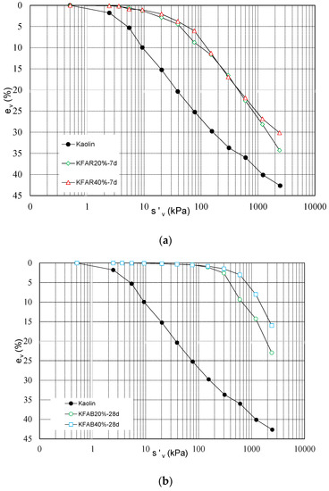 One dimensional compression tests on not treated and treated kaolin as function of binder content: (a) KFAR20% vs. KFAR40%—7 days of curing; (b) KAFB20% vs. KAFB40%—28 days of curing.
