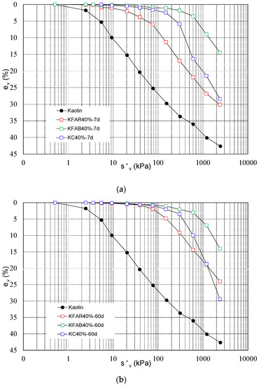 A comparison between the mechanical performance induced by alkali activated binders (KFAR40%; KFAB40%) and by ordinary Portland cement (KC40%—kaolin treated with 40% of cement) has been shown in Figure 5 for samples prepared with the same binder content and cured for 7 and 60 days, in order to highlight the role of type of binder on the mechanical improvement of treated soil. Results show a lower compressibility reduction and yield stress increase for KFAR treated samples compared to cement treated samples, whereas the compressibility curves of KFAB treated samples show a lower compressibility and higher yield stress than those pertaining to cemented samples (KC40%). The post-yield behaviour induced by ordinary Portland cement shows the highest slope of the compressibility curve, highlighting a more evident de-structuration stage for cement treated samples at increasing vertical stresses.