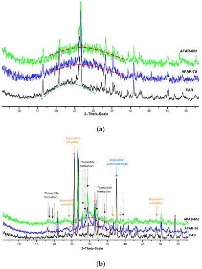 X-ray diffraction patterns of raw and alkali activated fly ash binders (AFAR and AFAB) are shown in Figure 6. The mineralogical composition of fly ashes is modified by alkaline activation process. With reference to alkali activated FAR (Figure 6a), the precipitation of new compounds in gel like state is evidenced by the broad bending detected between 25° and 35° resulting from the dissolution of initial amorphous phases of the ash (halo between 17° and 30°). In Figure 6b, consumption of crystalline phases of alkali activated FAB, such as anhydrite and aluminium oxide is evidenced by the disappearance of their characteristic peaks after 7 days of curing. The precipitation of new crystalline phases such as thenardite (Na2SO4) seems to be consistent with the release of sulphate from anhydrite dissolution and its subsequent reaction with sodium provided by silicate solution. A broad reflection corresponding to new poorly crystalline compounds resulting from alkaline-activation reactions was observed in the treated samples starting from 7 days of curing time.