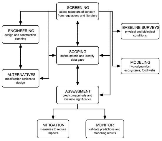 - Scoping. Scoping is a phase that determines of the most important receptors for analysis, i.e., the ones susceptible to undergo the largest impacts. This step is intended to occur preferably before, or at least during, project development and it is also intended to develop a scientifically expert-based identification of receptors of impacts (biotic, abiotic, social, and economic). This step is usually given equal attention in both developing countries and transitioning countries [].