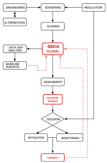 We therefore propose a new approach to EIA, that we call a System-Based EIA (SBEIA; Figure 2), which is inspired by the technical definition of an “Ecosystem” within ecological theory. From this point of view, the fundamental property of an ecosystem is that all organisms find the condition for their co-existence in their environment (both abiotic and biotic). This means that the model must encompass in the same conceptual framework living organisms, ecological interactions, and physical factors (including environmental conditions and resources), ensuring that living organisms can persist under the defined “environmental” conditions. The framework moves System-Based modelling, sensitivity analyses, and validation to the center of the IA process (Figure 2), but does not guaranty an internal condition for the coexistence of living organisms, rather defined general conditions for their presence within the EIA domain. It aims to provide policy makers, funding institutions, companies, and the public a comprehensive, data-driven picture of the eco-systemic, economic, and societal costs and benefits of a particular project design, alternative scenarios, as well as daily operations. In addition, we assert that the adoption of an SBEIA type framework would constitute an economic rationality for project proponents and lenders. This could provide an added impetus for more accurate impact assessments in transitioning nations, where large, international institutions, such as the IMF and World Bank fund many infrastructure projects.