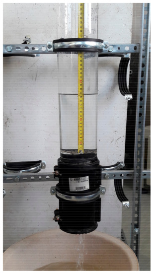 The hydraulic conductivity of pervious concrete specimens was tested using the falling-head permeability test. For this purpose, our own apparatus was constructed, as illustrated in Figure 2. The initial water level in the stand-pipe was 350 mm and the final water level was 50 mm. The time needed for water level to fall from 350 mm to 50 mm was recorded. Values of hydraulic conductivity were calculated and were expressed using the following equation: