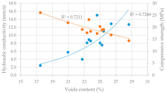 The dependence between void content, hydraulic conductivity, and compressive strength is illustrated in the Figure 3, while the exponential regression model was applied. The experiment shows very tight dependence between void content and hydraulic conductivity (R2 = 0.73), as well as between void content and compressive strength (R2 = 0.72).
