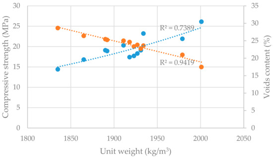 The dependence between unit weight, compressive strength, and void content is illustrated in the Figure 4, while the linear regression model was applied. The experiment shows very tight dependence between unit weight and compressive strength (R2 = 0.74), as well as between unit weight and void content (R2 = 0.94).