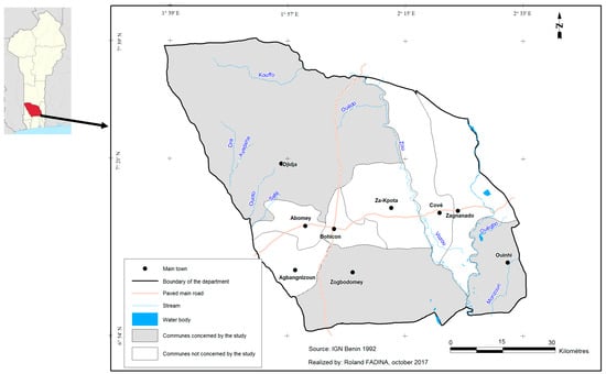 The study was conducted in the Zou Department of southern Benin (Figure 1). It is a plateau area from 200 m to 300 m altitude. There is a transitional climate between the sub-equatorial climate and the humid tropical climate of the Sudan-Guinean type of North Benin. The average annual rainfall varies between 900 mm and 1200 mm. The period of vegetative growth varies between 80 and 100 days. In Zou, there are two rainy seasons (March to July) and (August to October). The agricultural calendar follows the rainfall pattern []. The soils are clay-sandy ferralitic land, which is highly degraded but very well drained with a low retention capacity. Deep and easy to work, they are suitable for almost any crop. Vertisols and hydromorphic soils are also found in depressions. The vegetation is dominated by a natural palm plantation (Elaeis guineensis) and grasses but a few classified or sacred forests are also encountered []. The department of Zou is subdivided into nine communes namely: Abomey, Agbangnizoun, Bohicon, Covè, Djidja, Ouinhi, Zangnanado, Za-kpota and Zogbodomey.
