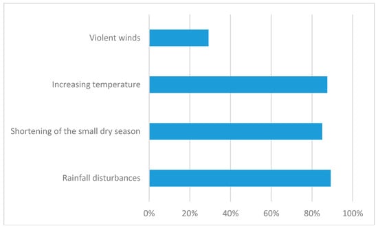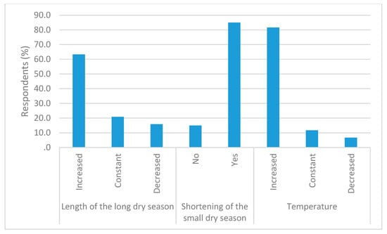 Changes were perceived in temperature and droughts (Figure 4). Almost 64% noticed an increase of the length of the long dry season and 85% of farmers claimed that the small dry season was shortening. Most of the respondents observed an increase of temperature.