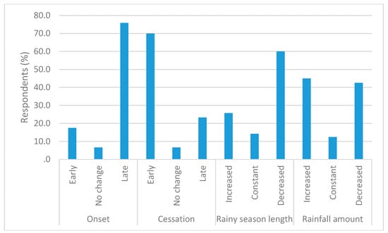 When farmers were asked how the rainfall patterns had changed, all the respondents had observed a number of changes in the overall climate pattern (Figure 3). Most farmers claimed that the rainy season started later (75.8%) and stopped earlier (70%). The majority of respondents (75.8%) noted a delay in the onset of the rainy season. Sixty percent of respondents claimed that the rainy season length had decreased. Regarding rainfall, 45% of respondents noted an increase in rainfall amount and 42.5% claimed that the rainfall amount had decreased.